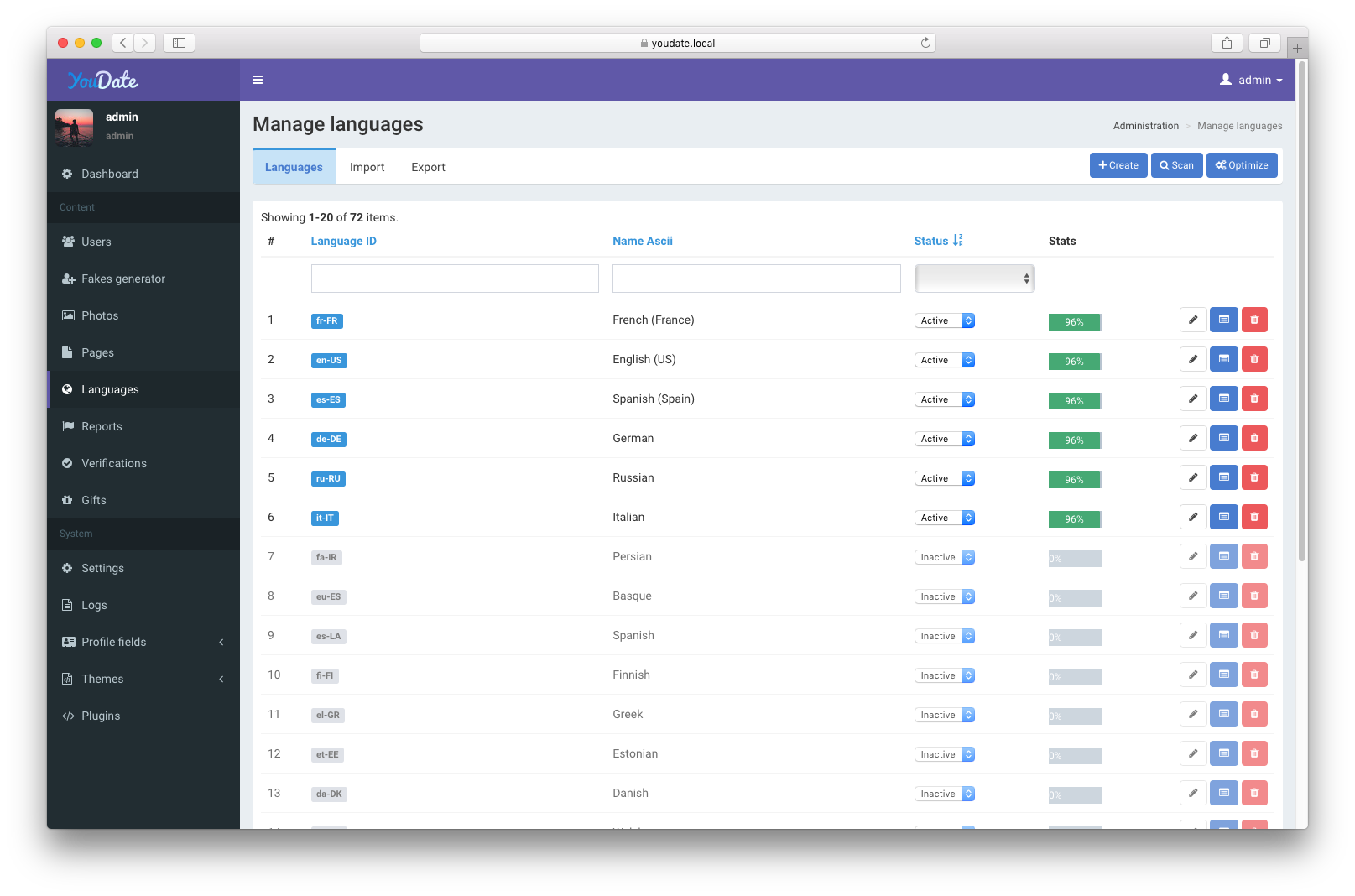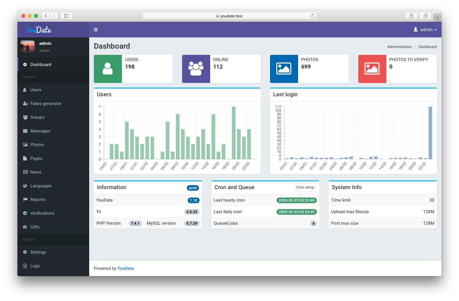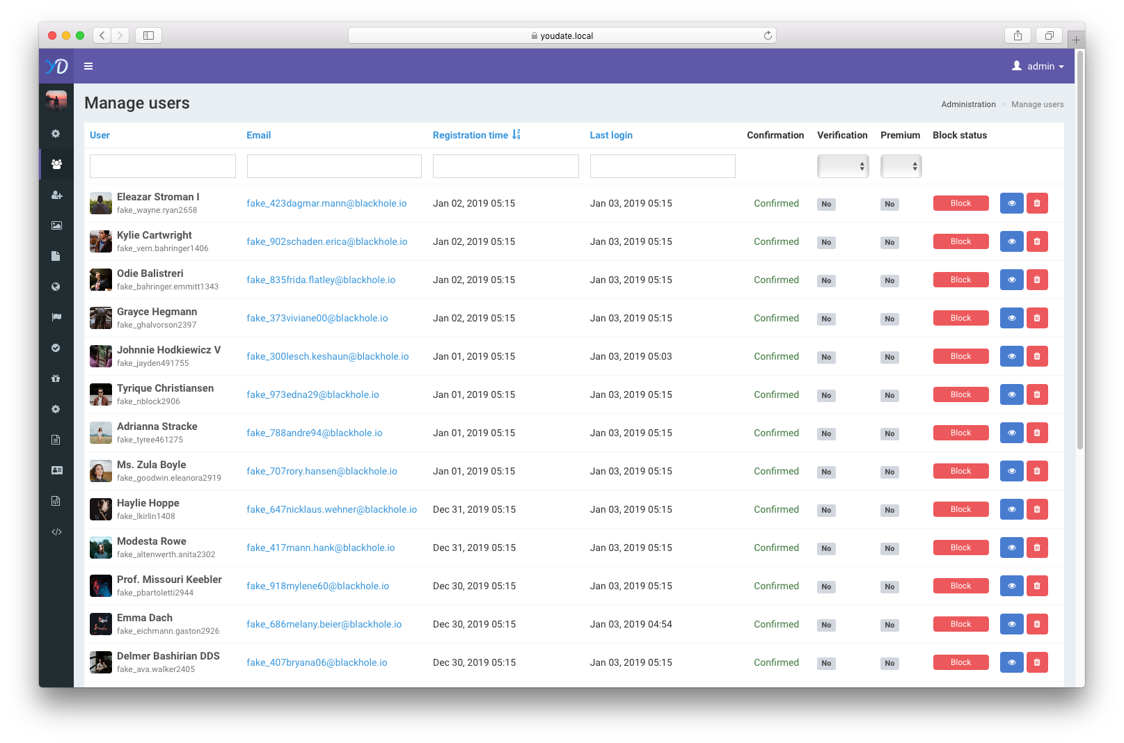Users management allows you to find users, update their information, block or delete profiles entirely. Also you can add/remove admin rights, add credits to their balance, toggle verification badge.