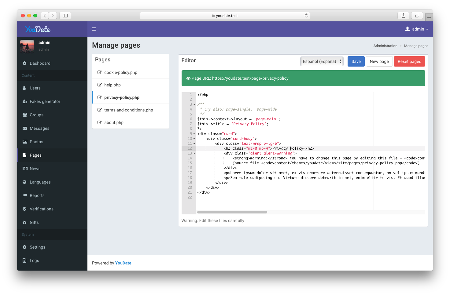 Pages management. Please note that you have to edit these files carefully - PHP code in this files will be executed; broken HTML structure will affect the resulting view. Also, you have an option to reset pages (restore all page files from the current theme).