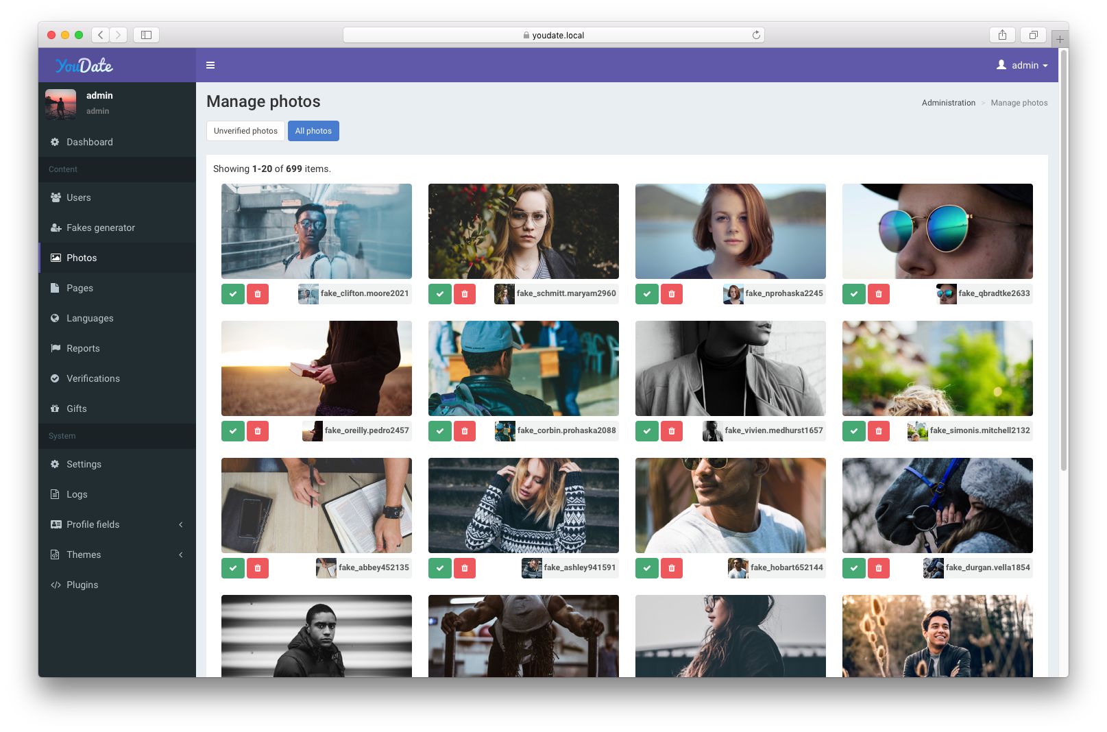 Photos management. Default scope shows unverified photos first. You can turn moderation off in the "Settings > Photos"