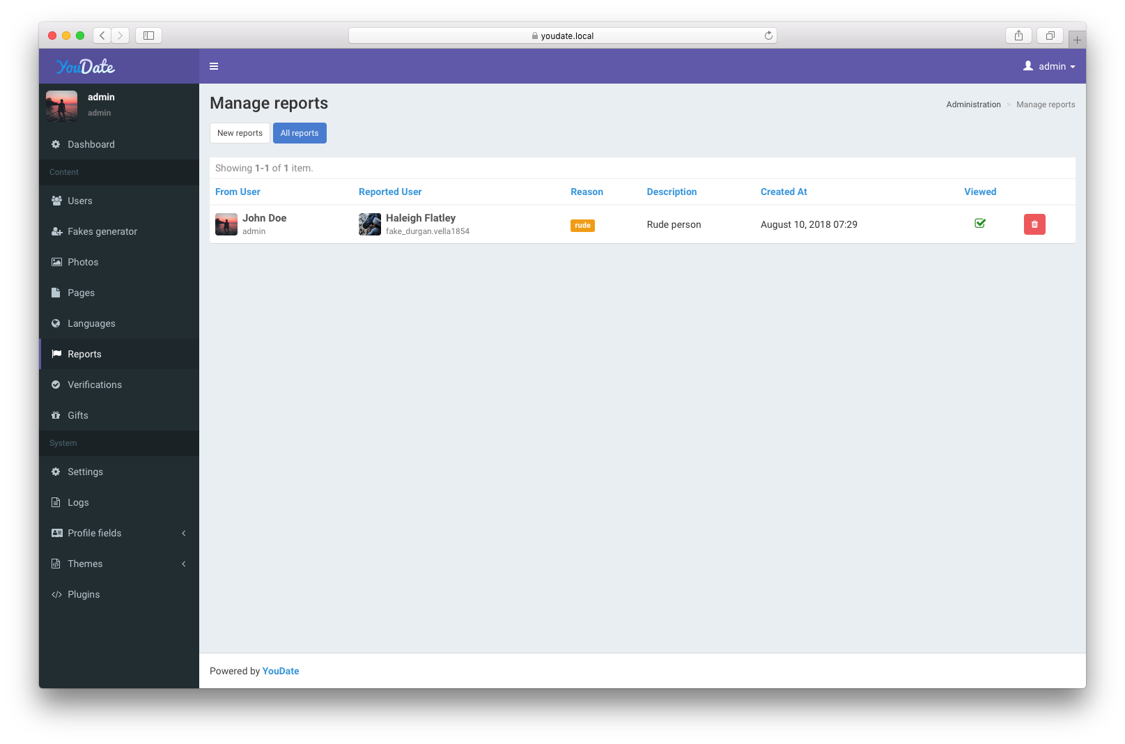 Reports management allows you to review all the reports and make verdicts (block users or mark report with "viewed" flag).