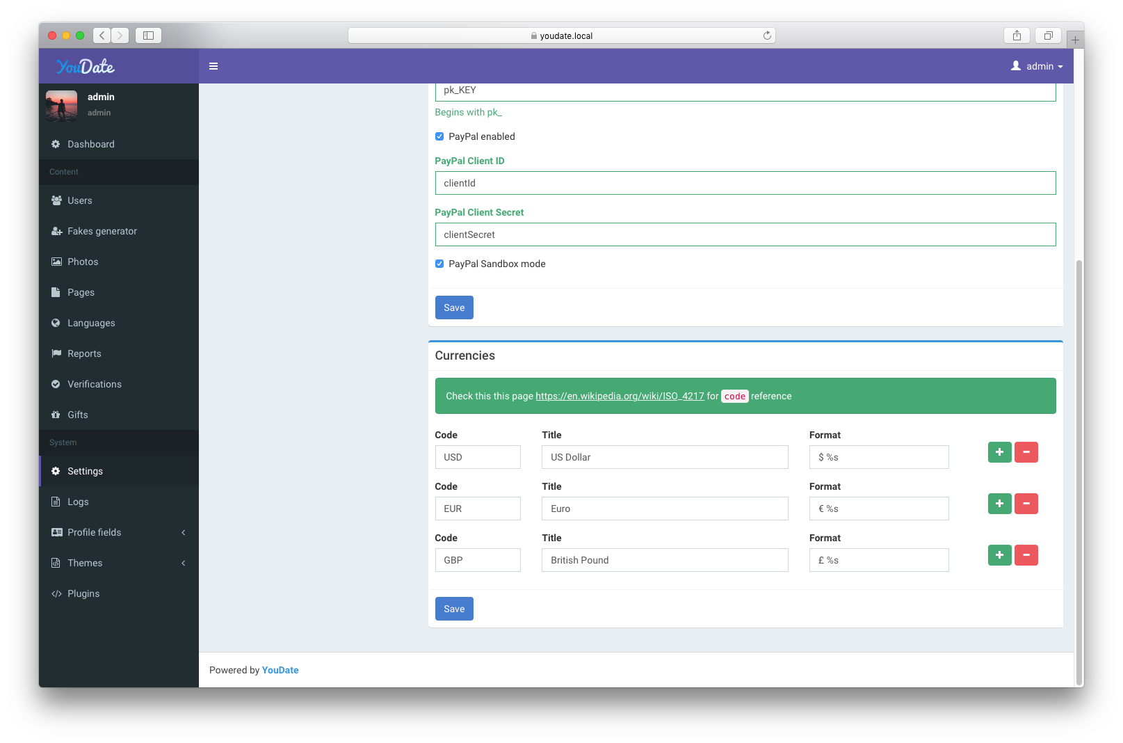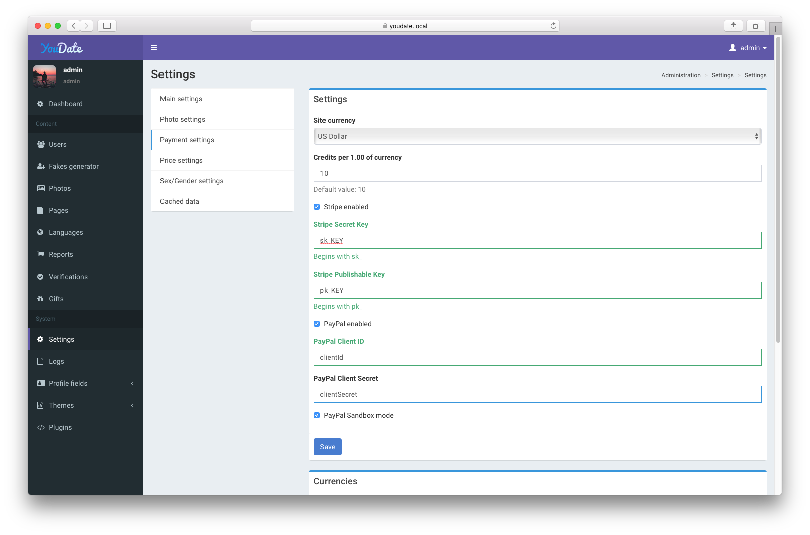 Payment settings includes currency options, Stripe and PayPal integration params (api keys/secrets).
