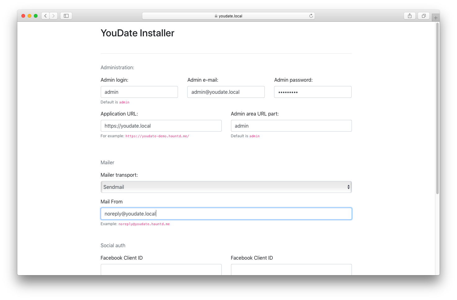 Facebook App ID and Secret - required for Facebook Login. Visit developers.facebook.com, follow the manuals, create an app and get the credentials. URI for OAuth redirection should be like this: