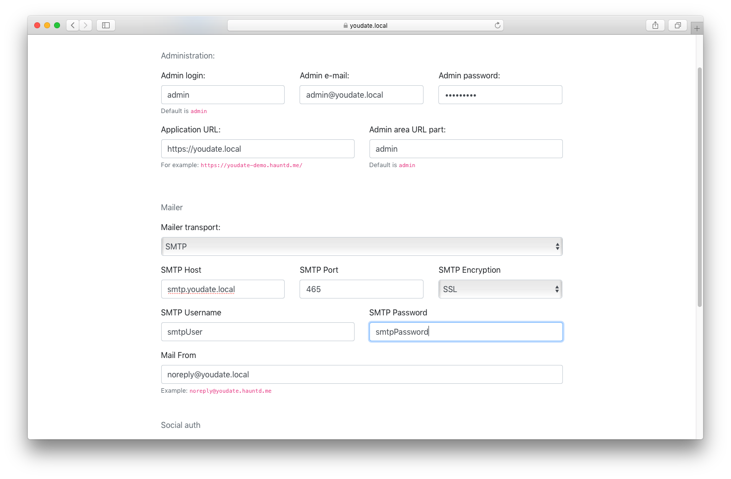 file: set database credentials, define mailer configuration, social auth credentials etc. - Make sure that these script directories are writable: