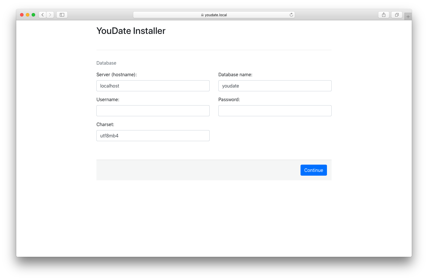 The next step is to configure the database. You must create a database for your script manually (the installer will not create it for you). Then fill out the form and click the "Continue" button. This action will check the database credentials and import the SQL dump (structure + minimum data).